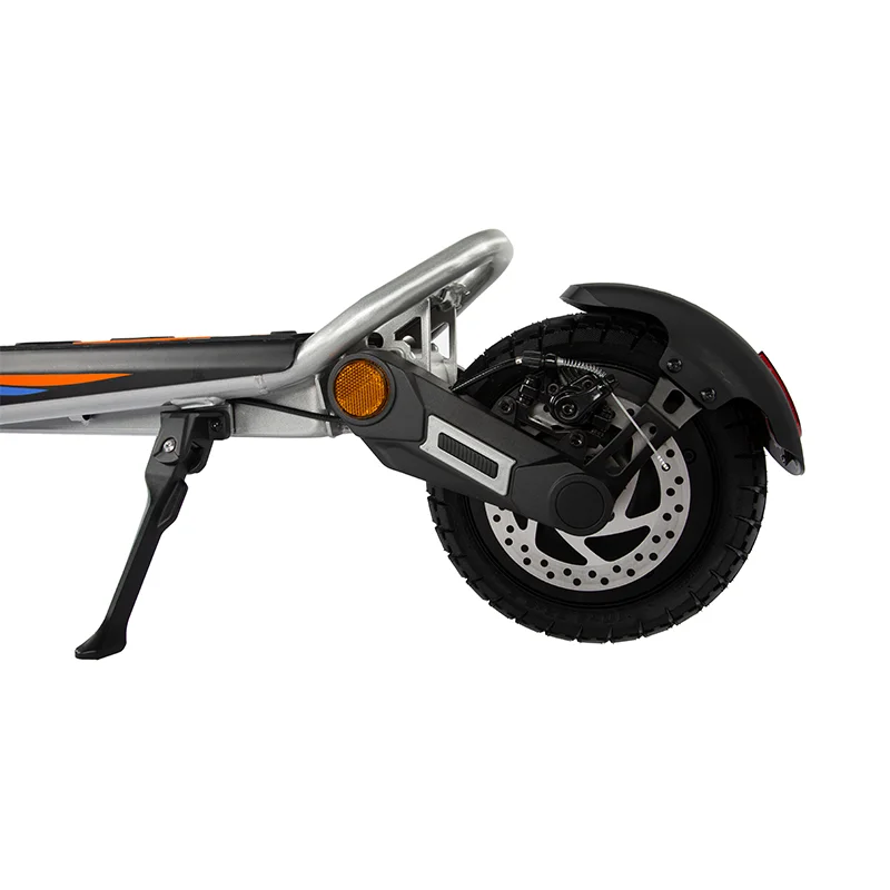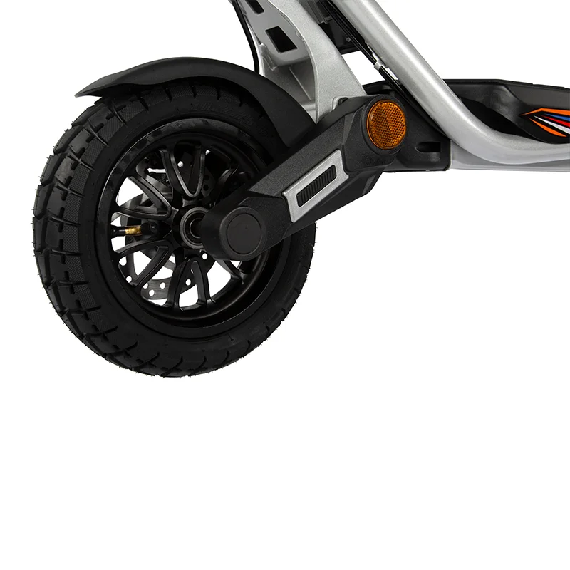 8-inch pneumatic tires provide comfortable rides over city pavement, and front and rear disc brakes ensure safe stopping.