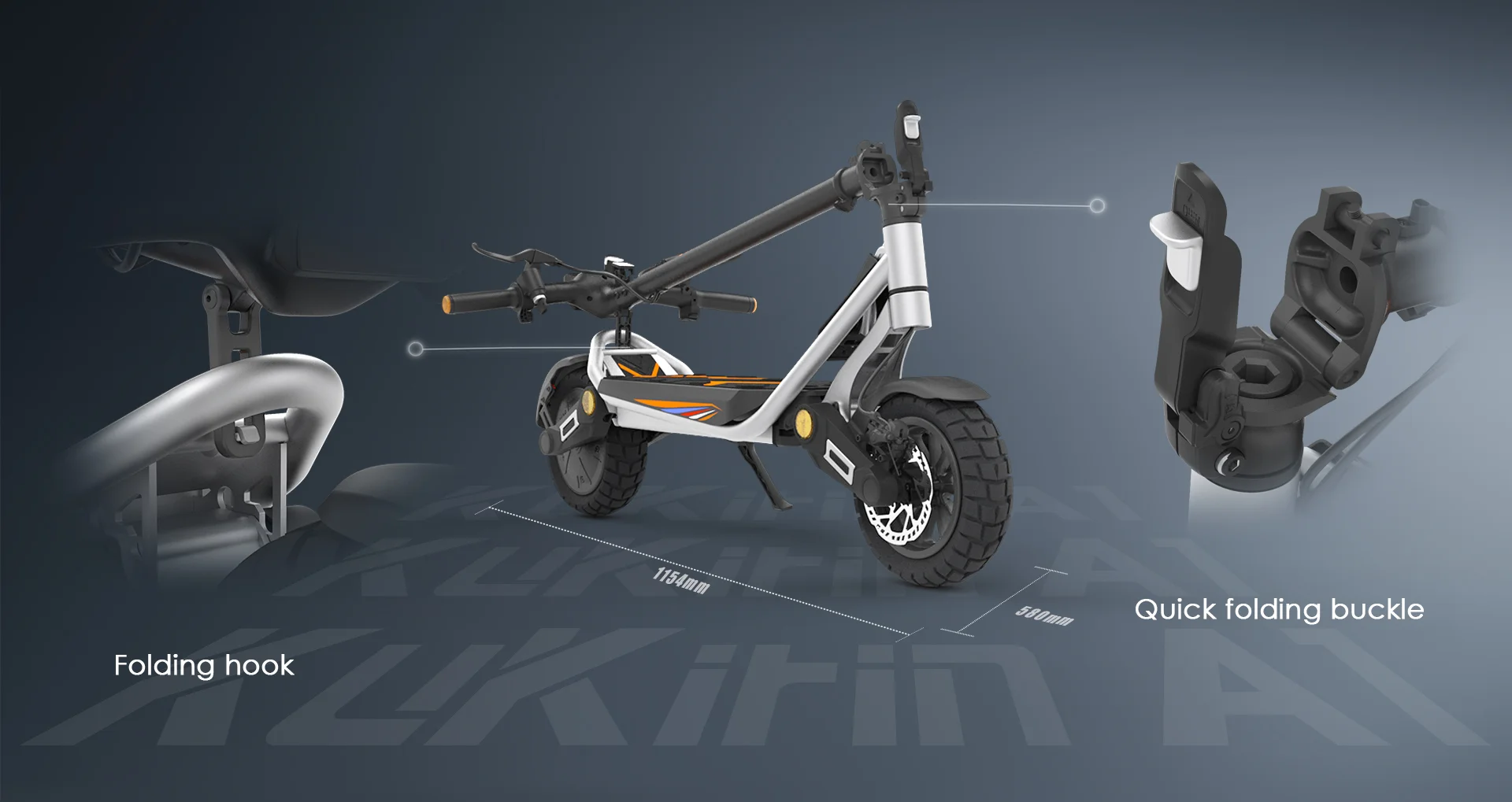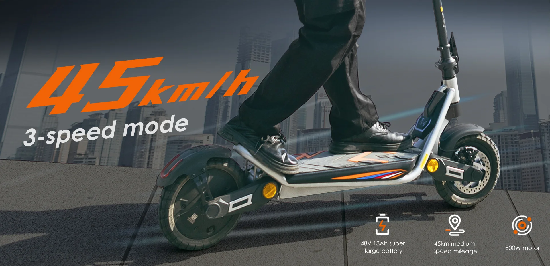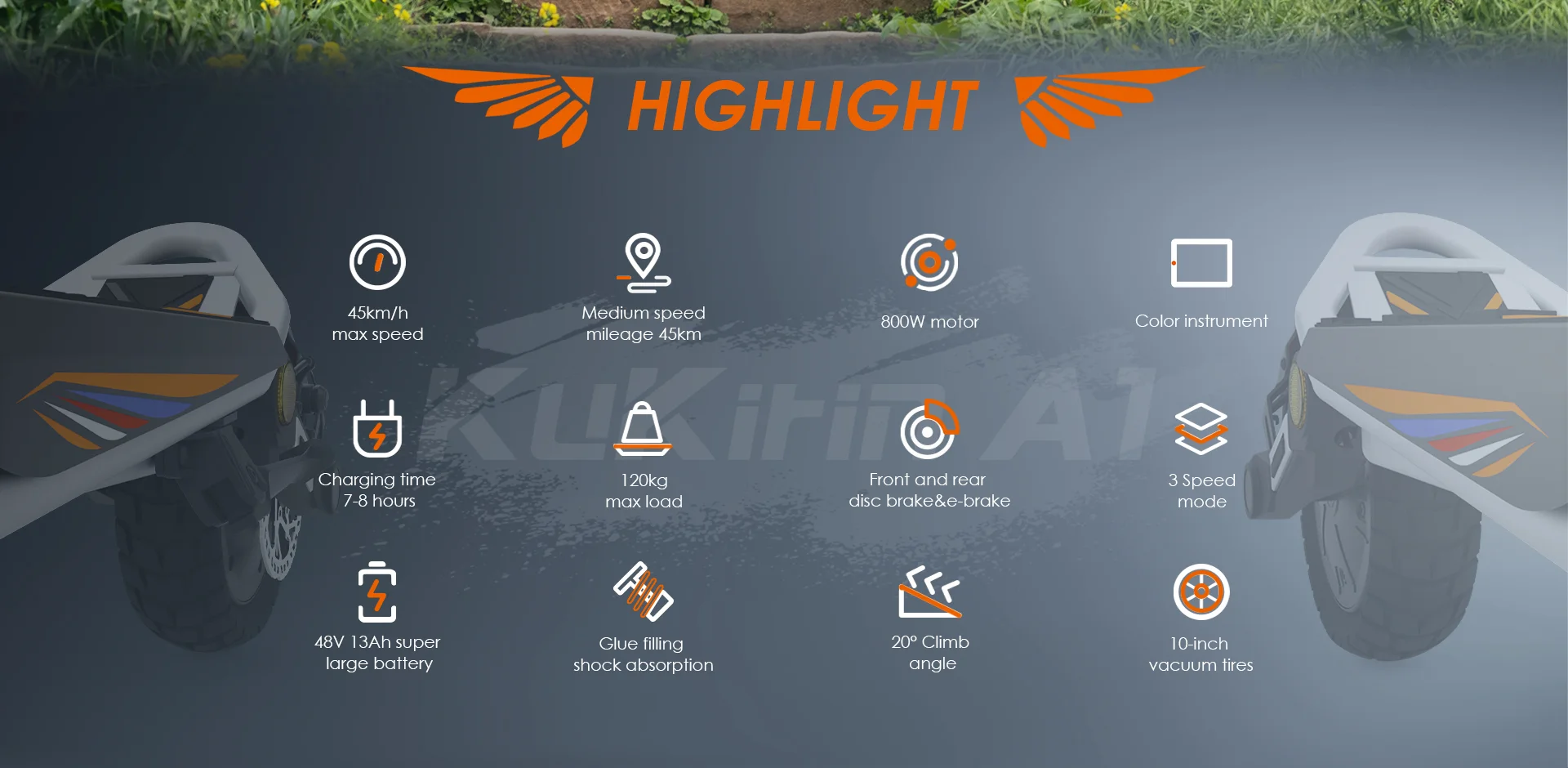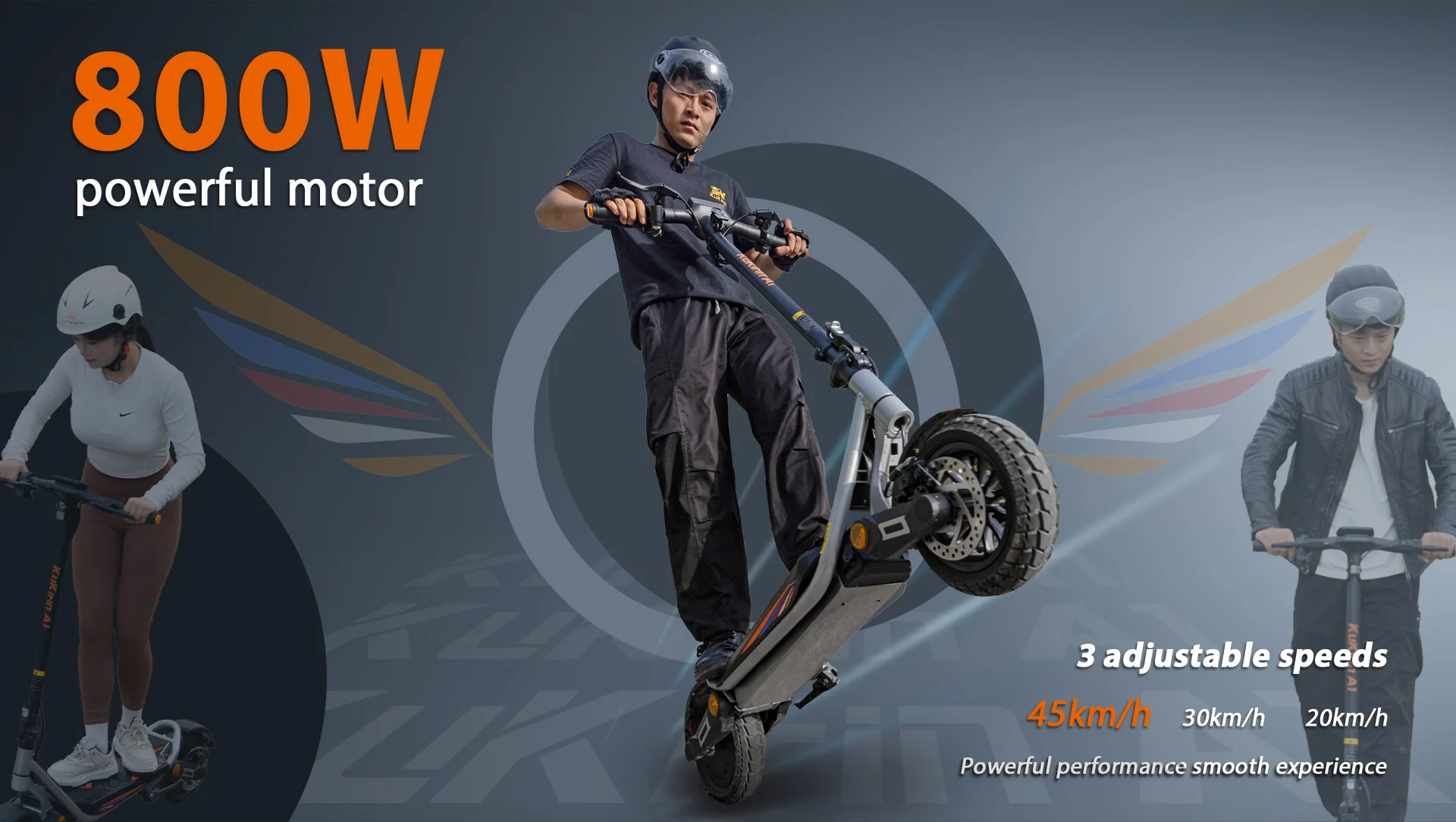 - Kukirin A1 Equipped with an 800W high-efficiency motor, it has strong power ready to go, and can easily conquer a 20° slope. The 10-inch vacuum tire has strong grip, and can easily cope with complex road conditions such as asphalt roads, stone roads, and gravel roads