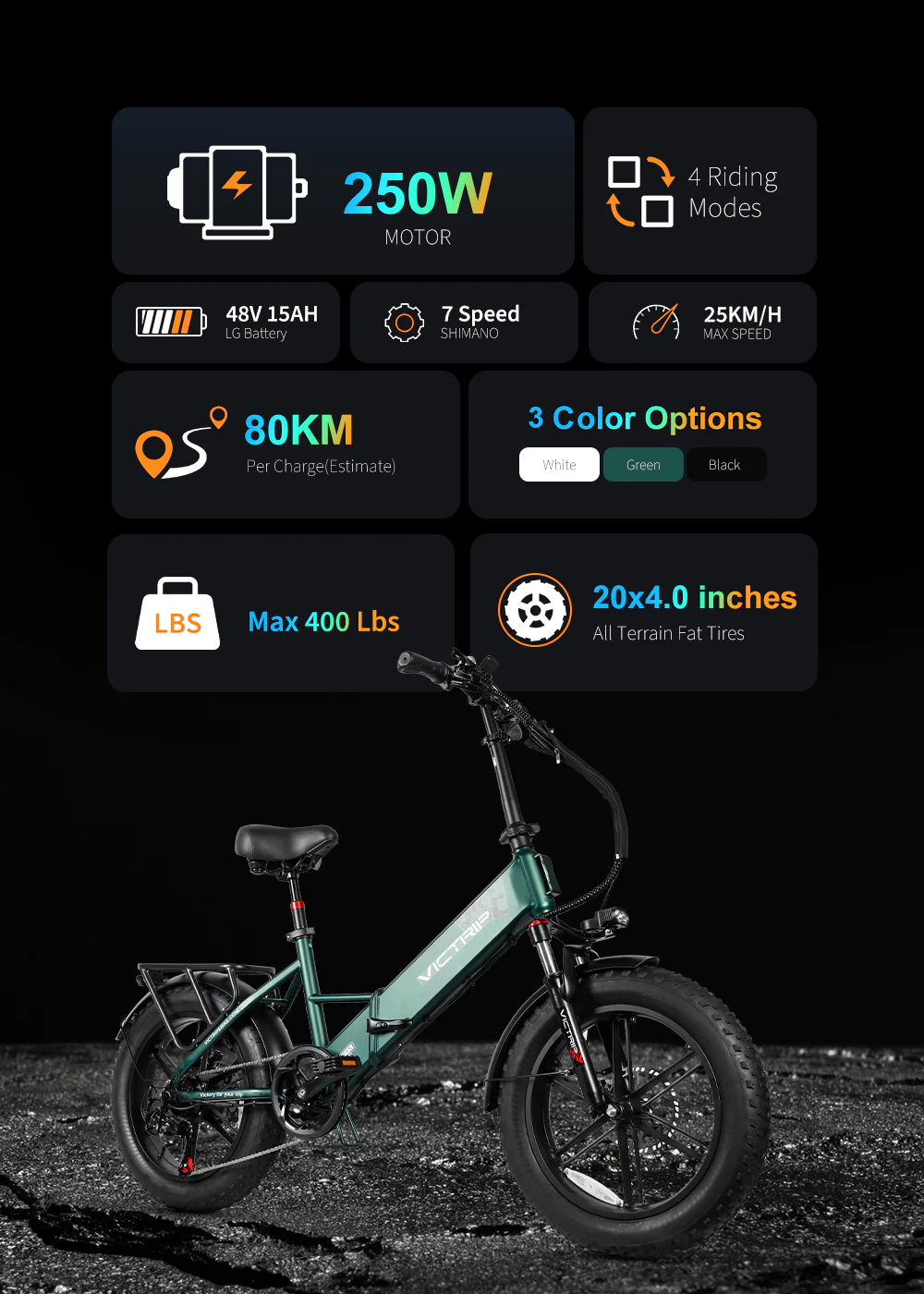 Weight limit –Maximum total weight limit (combined weight of rider and cargo) of 400 pounds (180kg).