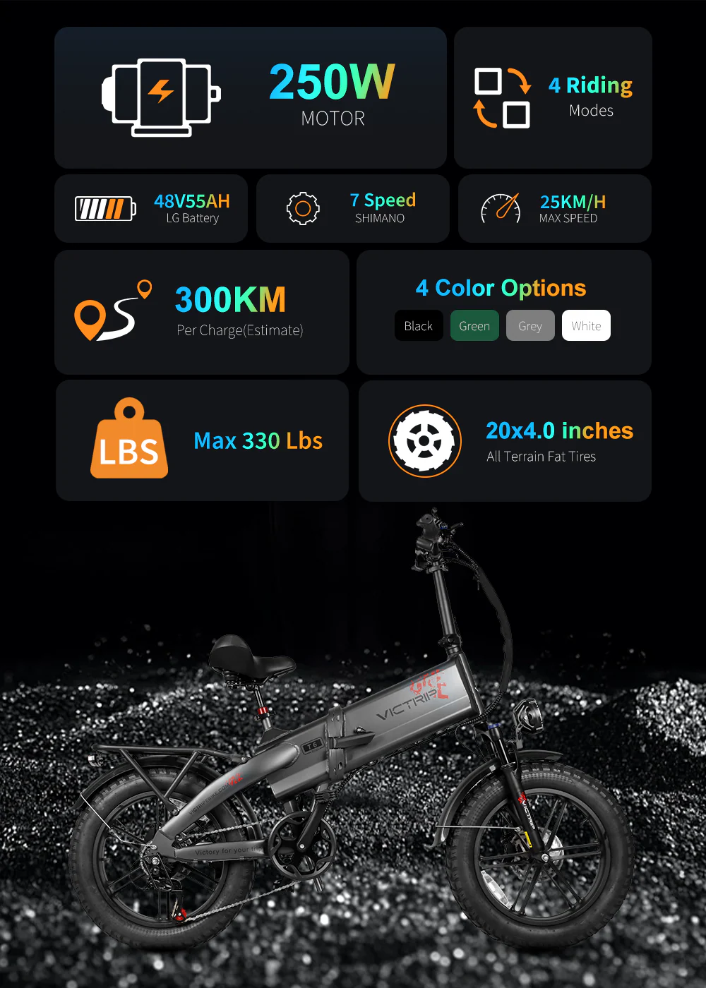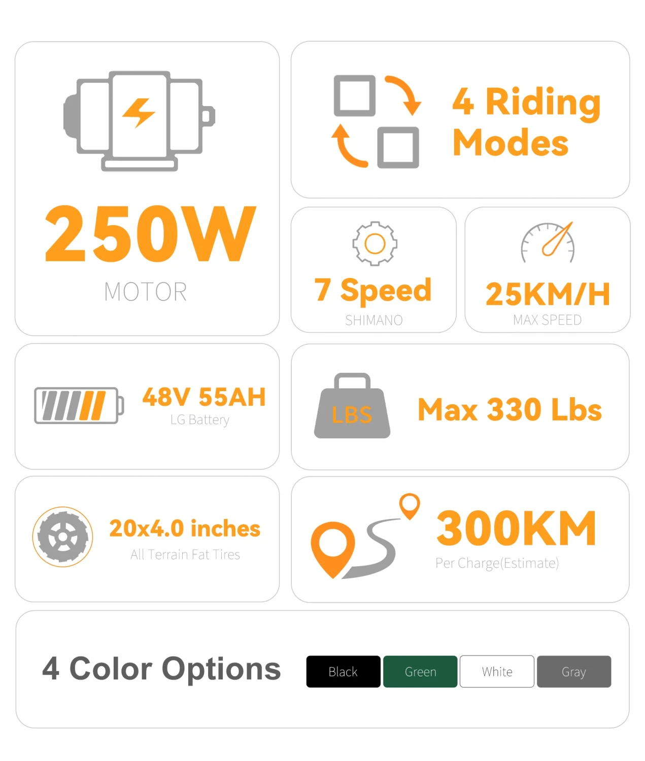 The high-quality front suspension fork absorbs bumps for a smooth ride, while 20×4.0 fat tires deliver excellent grip and stability across pavement, grass, and light off-road surfaces.